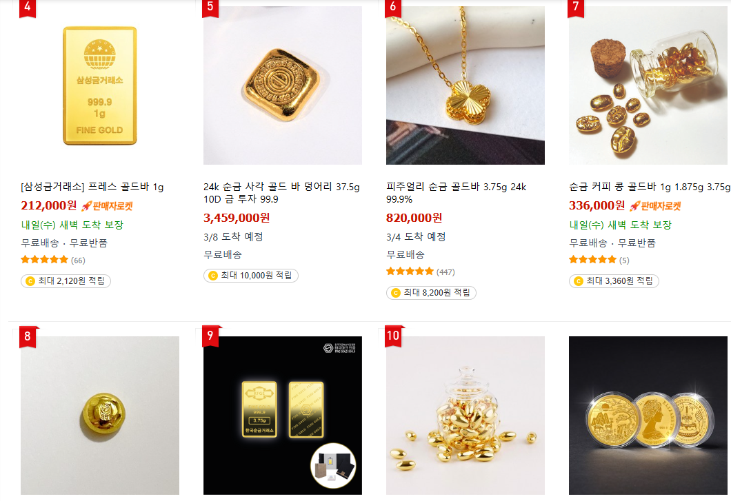 - 골드바: 10g, 100g, 1kg 등 다양한 크기로 구매 가능하며, 수수료가 낮아 장기 투자에 적합합니다.